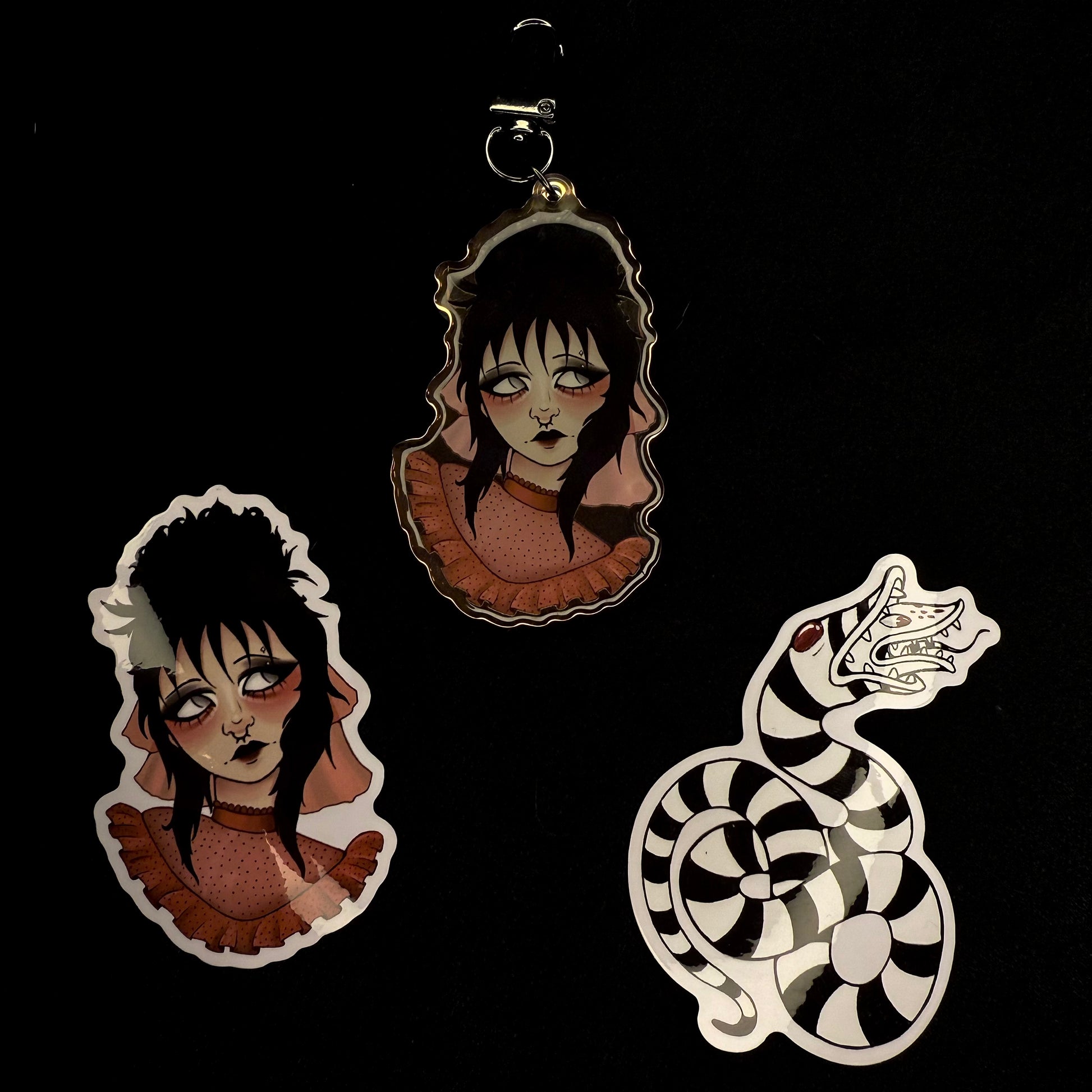 The lovely Lydia comes in both 3in. glossy vinyl sticker form as well as 2.5in keychain form, made with flashy rainbow acrylic with the design on both sides. Sandworm is also a 3in. glossy vinyl sticker, both heat and moisture resistant.