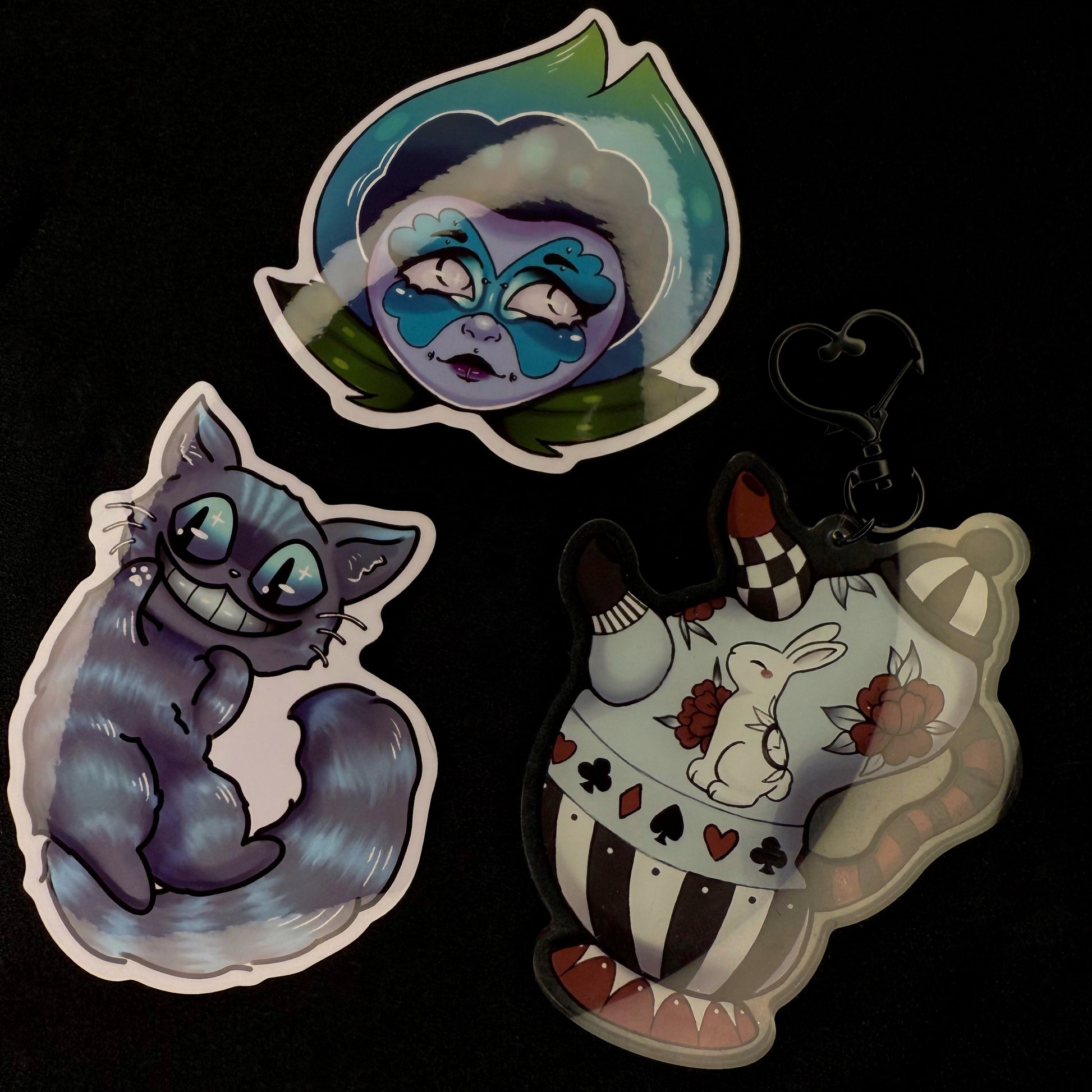 Enter wonderland with these curious goodies! All 3in glossy Vinyl stickers, heat and moisture proof! Teapot also available in acrylic keychain form, with the design printed on both sides complete with heart shaped clasp.
